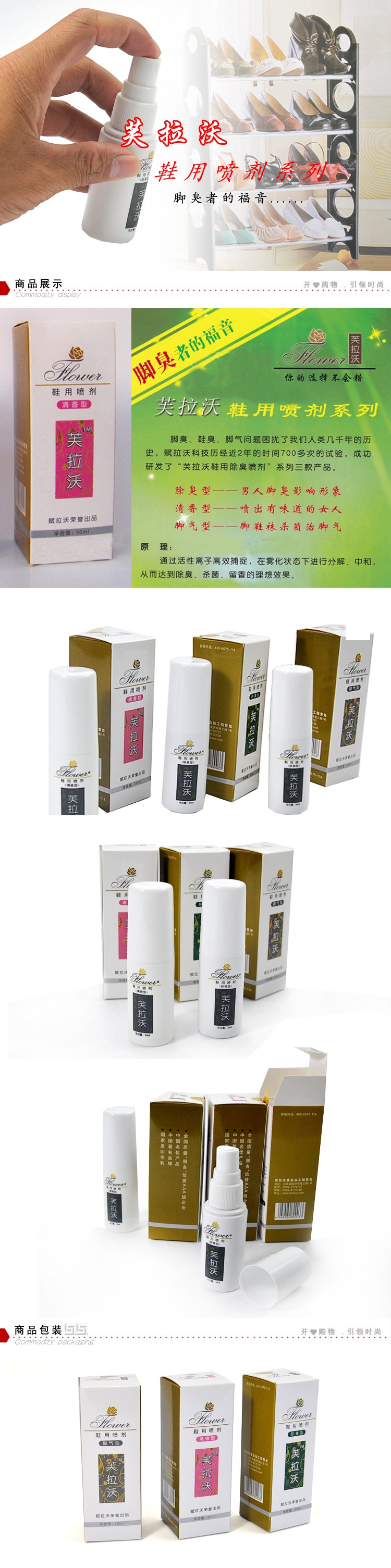 | [1] | 名 称 | 芙拉沃鞋内除臭喷剂 鞋子除臭液(清香型、除臭型、脚气型) | | [2] | 尺 寸 | 包装尺寸:11.5*4*4CM | | [3] | 颜 色 | 如图 | | [4] | 重 量 | 0.07KG | | [5] | 材 质 | 除臭液、中草药、纳米精等 | | [6] | 包 装 | 彩盒 |