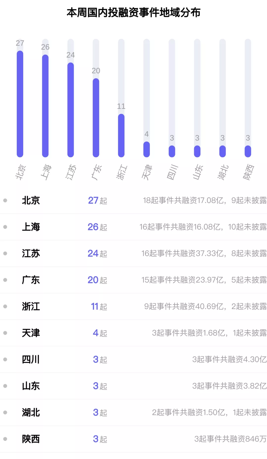 从本周披露获投企业的地域分布来看,主要集中在北京、上海、江苏。其中北京发生27起,上海发生26起,江苏发生24起。