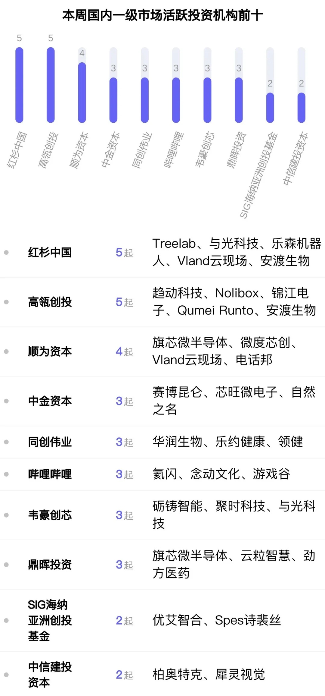 从机构投资活跃度来看,红杉中国、高瓴创投、顺为资本在本周创投市场中较为活跃。
