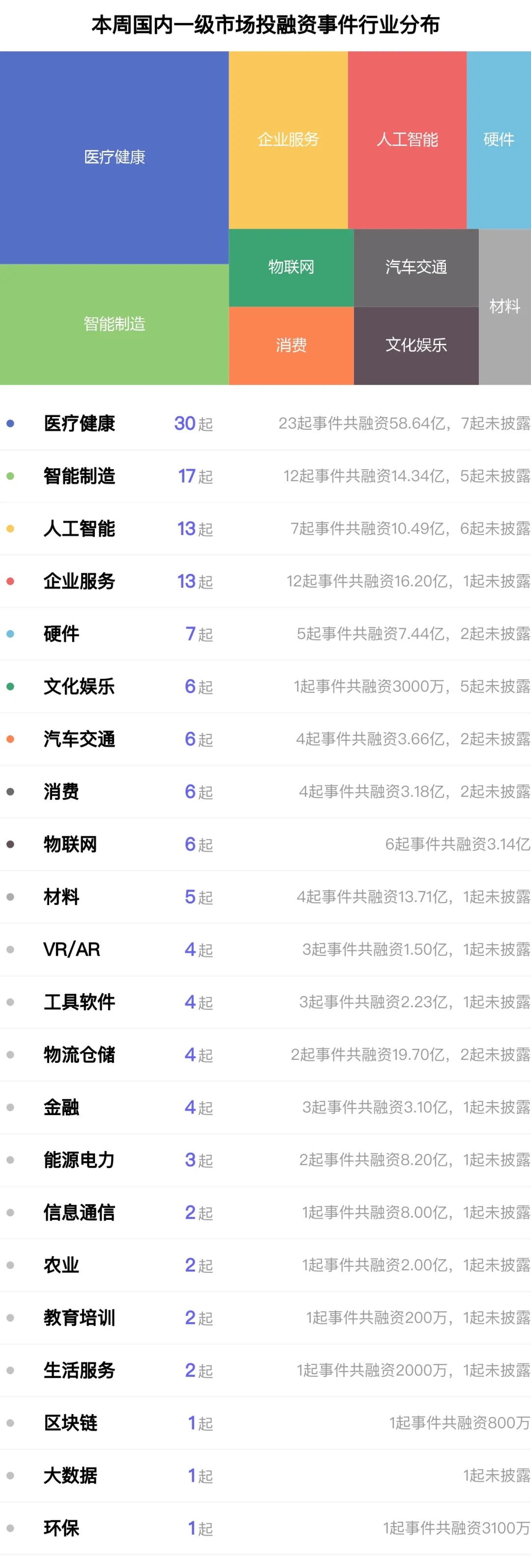 从融资案例数量来看,本周医疗健康、智能制造、人工智能领域融资最活跃,分别为30起、17起、13起。